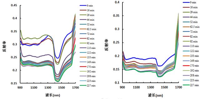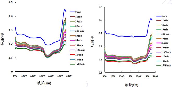 图5砾岩光谱反射率随着水渗入时间的变化(左为红色,右为绿色)