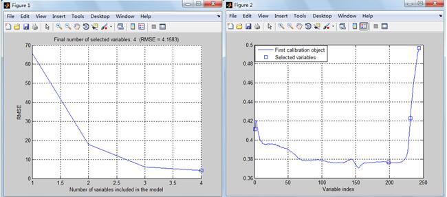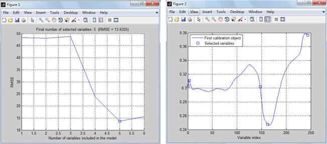 本研究利用Matlab编写的SPA来提取砂岩基于水渗入时间变化的特征波长,以减少变量的输入个数简化后期建模过程。SPA运算过程所设定的特征个数为3-10,特征波个数根据RMSE确定,如图8的Figure1所示,RMSE越小,水渗入时间的估算越精确,Figure2为确定特征波段的波段位置。表2分别列出了基于连续投影算法的砂岩随水侵时间的特征波长的波段位置,越靠前,其特征波段重要性越高,特征波段分别为1552.65、1658.47、1698.22、903.28 nm。