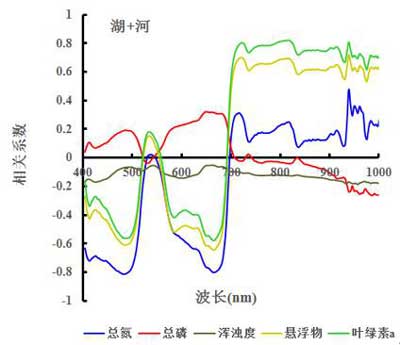 将星云湖和茅洲河采样点的水质参数(如总氮、总磷、悬浮物、浊度和叶绿素a)分别与其对应的光谱反射率值进行相关性分析,得到如图4所示的相关性曲线。从图4可知,在400-1000nm光谱范围内,浊度与各波段的反射率始终呈负相关关系,且相关系数并不高,相关系数绝对值在0-0.2之间;总磷与各波段的反射率呈正负相关性,相关系数绝对值最高的在660-690nm之间;总氮与各波段的反射率在400-530nm和540-695nm处呈负相关关系,在530-540和695-1000nm处呈正相关,相关系数在490nm和690nm附近有两个峰值;悬浮物和叶绿素a与各波段反射率相关性变化趋势一致,在400-690nm范围内呈正负相关性,在690-1000nm范围内呈正相关性,相关系数在490nm和690nm附近有两个峰值,在690-1000nm范围内保持较高的相关性。