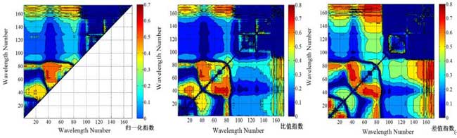 将波长从400-1000nm的所有波段反射率构建归一化指数、比值指数、差值指数分别与各水质参数进行相关分析,得到水质参数与各波段比值的相关系数分布图。以水质参数总氮为例,图5为水质参数总氮与归一化指数、比值指数、差值指数任意两波段组合的相关系数分布图。