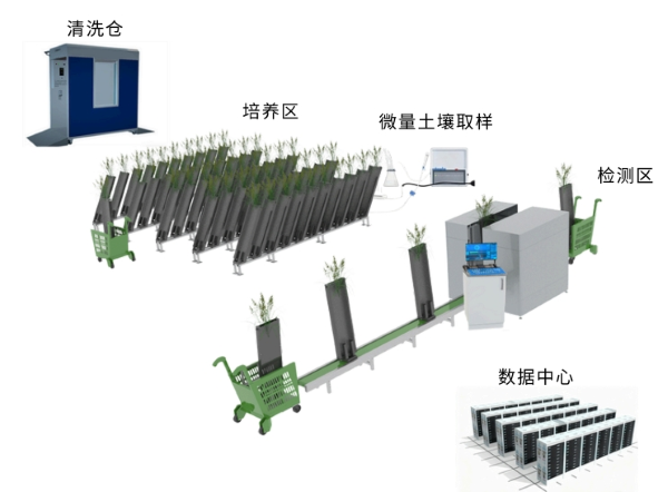 · 检测模块:由暗箱、成像系统、微量土壤取样模块、内置光源、固定系统、传动装置组成,负责检测目标植株各项生理参数。微量土壤取样模块旨在实现植物根际微尺度范围内(约0-5mm)土壤或溶液样品的无损、定量采集,用于根际分泌物、微生物群落及化学梯度的精细研究。传动装置支持批量检测,可同时容纳三板根盒。目标植株检测完成后,运输推车将根盒夹取并送回培养架原位;同时,另一推车同步将待检测的新根盒运送至传动装置,实现不间断数据采集。