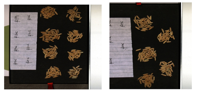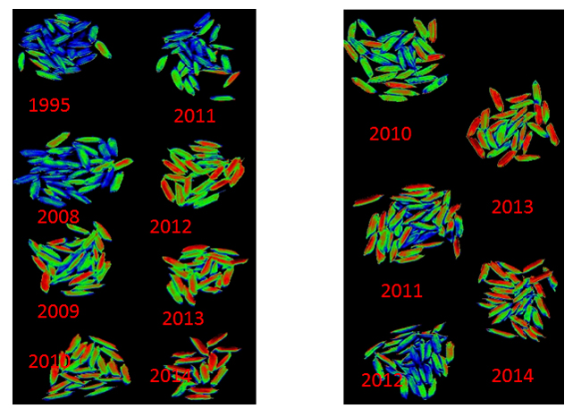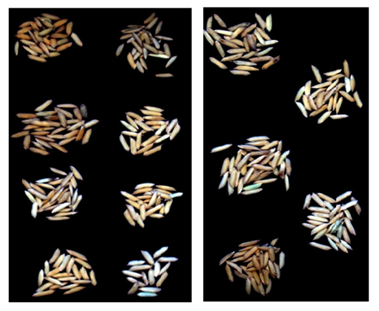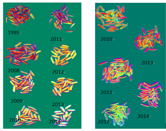 图3为不同年份的小麦种子的高光谱图像RGB合成图。左图为1995、2008、2009、2010、2011、2012、2013、2014共8年的小麦种子,右图为2010、2011、2012、2013、2014共5年的小麦种子.