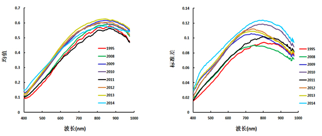 图 6 不同年份小麦均值、标准差的光谱特征变化