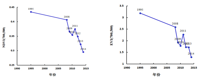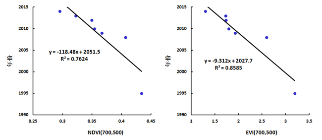 图 9 NDVI、EVI与其相对应年份的散点图
