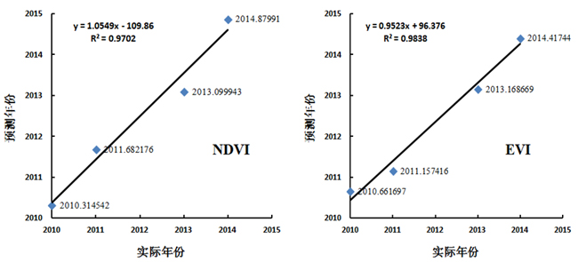 利用图9所得到的NDVI的建模模型y=-118.48x + 2051.5和EVI的建模模型y=-9.312x +2027.7来预测右图2010、2011、2013、2014共4年的小麦种子的年份,预测年份与实际年份的1:1图如图10所示,从图10可知,预测年份取整数部分,无论是NDVI还是EVI,其预测年份与实际年份完全一致,如取四舍五入取整,NDVI构建的模型有两年的预测年份超过实际年份1年,EVI构建的模型则有1年的预测年份超过实际年份1年。