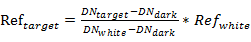 其中,Reftarget为目标物的反射率,DNtarget为目标物的DN值,DNdark为相机本身的暗点流DN值,DNwhite为参考板的DN值,Refwhite为参考板的反射率。