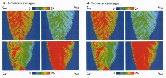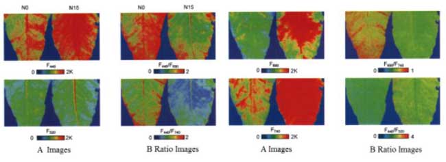 利用叶绿素荧光可以对植物的生长状况和各类营养元素缺乏症状进行鉴别。Subhash 等利用波长355 nm 的氙气灯作为激发光源,采集了烟草叶片4个波段( 中心波长分别为 440、520、690 和 740 nm)的荧光,分析了各波段的荧光比率对烟草叶片衰老情况的鉴别能力。结果发现,随着叶片的衰老,在各荧光比率中,叶绿素荧光比率( F 690 /F 740) 有明显上升,说明叶绿素荧光可以作为检测植物光合作用强弱的一项指标。Langsdorf等采用最大波长为340 nm的氙气灯激发甜菜叶片,获取相同4个波段的荧光图像及荧光比率图像,经伪彩色处理后,通过观察图像发现,短波荧光( F440和F520) 在叶脉部位强度较高,叶绿素荧光( F690和 F740) 在叶脉间隔部位强度较高,使用F440 /F690和F440 /F740这两个荧光比率能区分叶片含氮量的高低。Cadet等对向日葵正常叶片和分别缺乏氮、磷、钾的叶片进行实验后发现,缺磷叶片的红荧光和远红荧光强度比值( FRF /FFRF) 有明显下;缺钾叶片的蓝绿荧光强度有明显上升,并且从蓝绿荧光图像中可知:叶片的缺钾症状局限在叶尖和叶边缘部位。Benediktyová 等发现大量的紫外光子都被叶片表皮吸收,难以到达叶细胞更深处,激发的叶绿素荧光十分微弱。因此采用最大波长为455 nm的蓝色LED灯激发烟草健康叶片和病害叶片的叶绿素荧光,通过叶绿素荧光的三维重建图,将叶片结构可视化,对不同深度的叶细胞进行伪彩色处理,通过观察图像发现,受病害浸染的细胞深度位于健康细胞下方约25μm处。Pereira 等采用波长473 nm 的激光激发柑橘黄龙病叶片,提取荧光图像的10个颜色描述符对叶片感染黄龙病的过程进行跟踪。结果发现,绿色描述符的范围、均值和标准差等值在染病到发病的整个阶段都有明显变化。Pereira 等认为该方法可实现植物病害的无损检测,检测过程无需样品预处理,具有检测早期( 染病后1个月) 患黄龙病柑橘叶片的潜力。Sankaran等选取两个品种的柑橘叶片,分别在实验室条件和自然环境进行实验,用4种LED灯( 紫外、红、绿、蓝) 照射叶片,每个LED灯能激发 3个波段荧光(黄、红、远红) ,总共提取了病害叶片的12个荧光特征和10个荧光比率特征,基于这22 个特征分别用两种分类方法对病害叶片和健康叶片进行了鉴别。结果表明,贝叶斯分类法在实验室条件下的分类准确率高于85% ,而采用决策树分类器的计算时间是前者的10多倍,但是后者在实验室条件和自然环境都具有更好的识别能力,分类准确率高于94%。此外,在22个特征中,由紫外激发的黄色荧光( YF_UV) 和由绿光激发的荧光比率(SFR_G) 能区分柑橘黄龙病叶片和缺氮叶片。