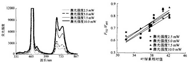 图5 473 nm激光激发荧光光谱及荧光光谱参数 F732/F685与叶绿素含量关系