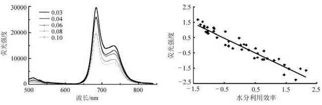 图6 叶绿素荧光光谱及强度与叶片水分利用效率关系