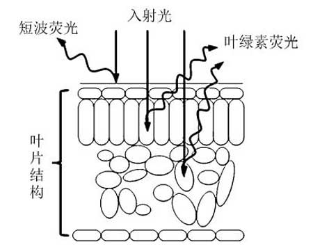 经光照射后,植物的不同组织会吸收不同波段的光,因此植物能在不同波段发射出荧光,如图2。激发光主要有以4个波段: 蓝(波长435-480 nm),被类胡萝卜素和叶绿素吸收,并释放出较高量子效率,可以激发叶片表皮及更深处组织的叶绿素荧光;红光(波长 640-780 nm),只能被叶绿素吸收,因而相比蓝光还能被类胡萝卜素吸收,该波段光的吸收范围较窄,能激发远红波段的叶绿素荧光;绿光(波长 500 ~ 560 nm),被叶绿素吸收,但是吸收量很小,因而相比蓝、红光,绿光可以到达叶片的深度最大,能激发叶绿素荧光;紫外光(280 ~315 nm)既能激发叶绿素荧光,还能激发短波荧光。