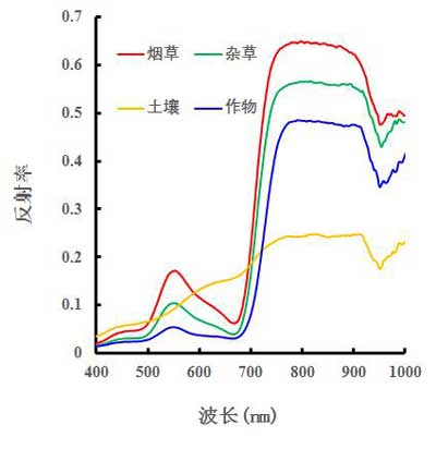 图4为无人机高光谱影像上烟草、杂草、作物以及土壤在400-1000 nm范围的光谱曲线。从图中可知,烟草的光谱反射率高于杂草的光谱反射率,而杂草的光谱反射率则高于作物的光谱反射率,土壤的光谱反射率在400-760nm范围内保持稳定上升的趋势,在760-900nm范围内光谱差异不大,在900-1000nm范围内有一峰谷,这是因为水汽吸收的原因。