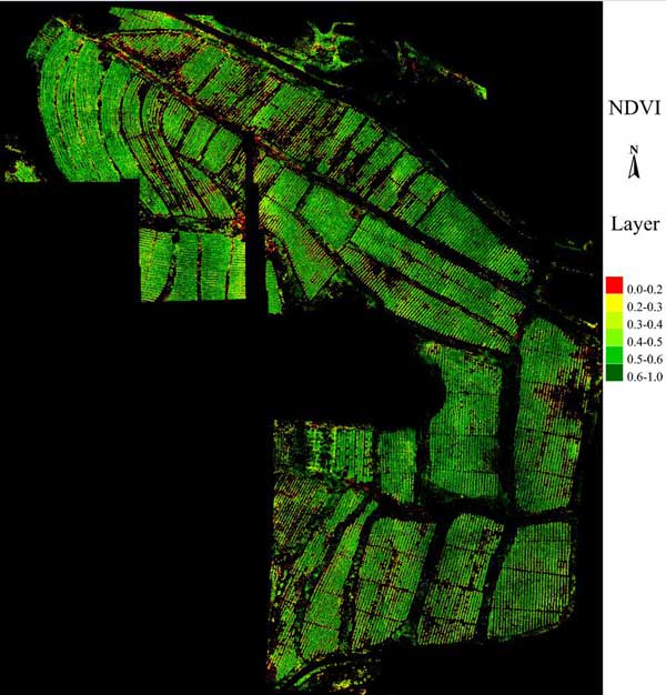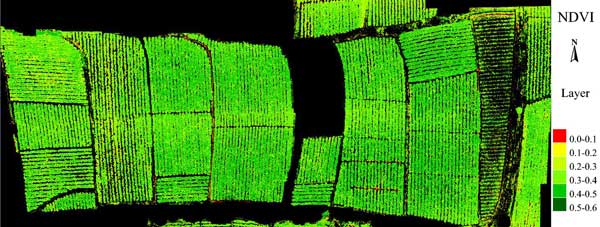植被指数是一类具有一定生化意义的不同波段光谱值的组合,通常有比值植被指数、线性组合植被指数、修正植被指数、差值植被指数等。不同波段组合的植被指数对于不同指标预测效果不同。在农业上,基于光谱技术检测作物生理指数的波段范围一般在 400~2 500 nm 之间,涉及到色素(叶绿素、类胡萝卜素等)、氮、水分等吸收和叶片细胞的内部结构。在 400-740 nm 可见光波段,叶绿素在 480、650、670-680、740 nm 处有吸收峰,类胡萝卜素在420、425、440、450、470、480 nm 均有吸收峰,叶黄素在 425、445、475 nm 有吸收峰。而在 740-1 300 nm 近红外波段由于健康的叶肉细胞反射作用,其反射率急剧升高;作物水分的吸收峰主要集中在 970、1 450、1 944 nm 处。因此当作物受到胁迫作用时,相应的氮、色素、酶等发生变化,通过应用各种植被指数监测这些生理指标变化,可判断作物胁迫情况、生长状况以及产量情况。图5为大理、楚雄、石板桥镇烟草基地烟草的NDVI分布图(NDVI采用的绿光波长与红光波长的),NDVI值越大则说明长势越好。
