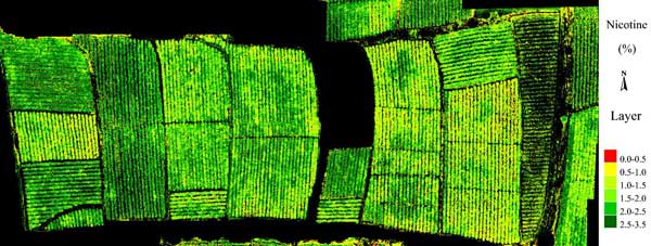 从烟草的NDVI和叶绿素a/b、总氮和烟碱反演分布图来看,石桥板镇烟草基地的烟草与其他作物和杂草的含量差异显著,特别是烟碱作为烟草特有的属性,其与其他作物、杂草差异尤为显著,因此利用无人机高光谱可大范围快速识别烟草,可帮助决策者判断烟草的种植面积。同时根据大理、楚雄和石板桥镇烟草基地的烟草NDVI、和叶绿素a/b、总氮和烟碱反演分布图来看,利用无人机高光谱技术可以判别烟草的长势及监测生化参数的含量,为决策者定量施肥、灌溉、喷洒农药等提供技术支持,同时根据烟草烟碱的分布图,可以判断烟草的品质。