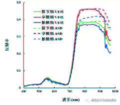 图 2 不同生育期成像光谱仪V10E 光谱曲线与 重采样的 ASD 光谱曲线对比