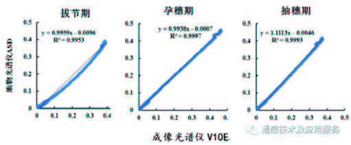 图3 不同生育期的成像光谱仪V10E 和 重采样的 ASD 光谱反射率的相关性