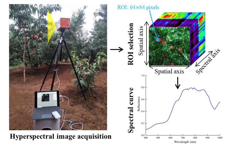 肥城桃因其良好的品质和丰富的营养而广受消费者喜爱,但肥城桃作为一种呼吸性气候的水果,其水分含量很高,容易变色、变软后变质。在日常的生产中,成熟的桃子通常采摘下来后就立即食用,而中熟的桃子被采摘下来后需要经过运输或储存很长一段时间才能上市。在此期间,桃子的质量属性(诸如可溶性固溶物含量和硬度等)会不断地快速变化,因此本文通过使用江苏通宝TB888相机GaiaField-V10E采集高光谱图像,并结合化学计量学来确定肥城桃的内部质量和判别不同成熟度阶段的肥城桃。