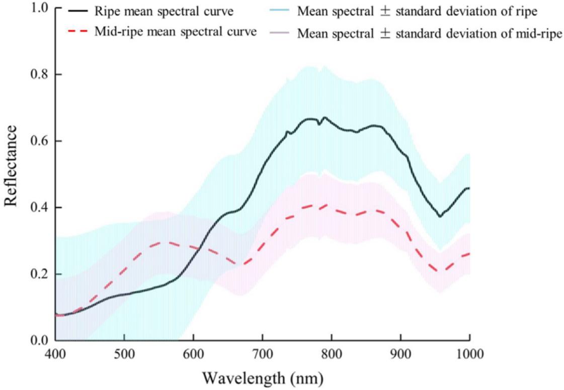 图2 中熟和成熟的肥城桃子的平均光谱反射率与标准偏差