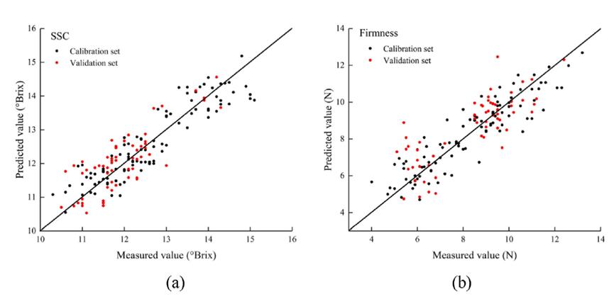 图3 SSC(a)和硬度(b)实测值与预测值散点图