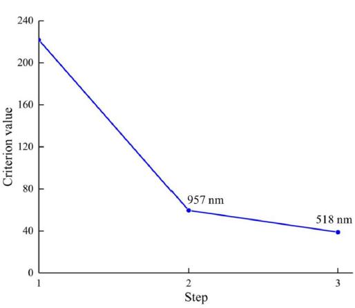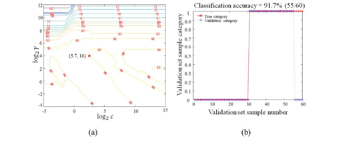 在此基础上,文章采用顺序前向选择(SFS)算法提取两个有效波长(957nm,518nm),如图4所示。随后使用LIBSVM模型对肥城桃子的成熟度进行辨别,如图5所示,图5a为模型选取的最佳核参数C=5.7和γ=16,图5b为模型分类识别的准确率,分类识别精度达到91.7%。