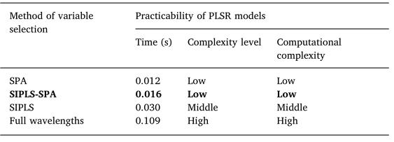 使用三个指标对PLSR模型的实用性进行评价(表2)。结果表明,SPA模型运行时间最短,其次是SIPLS-SPA模型,而全波段模型运行时间最长。SPA模型和SIPLS-SPA模型的矩阵复杂度和计算复杂度相似且较低,但全波段模型的矩阵复杂度和计算复杂度最高。