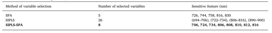 目前,协同区间偏最小二乘(SIPLS)或连续投影算法(SPA)已被成功应用于*优特征的选择。SIPLS可以保证所选波长的连续性,使模型性能稳定。然而,研究中发现SIPLS选择的区间位置和长度都是固定的,这表明优选特征中存在无用信息和共线性。而SPA是建立在凸几何端元搜索算法上的。因此,该方法可以降低对离群像素的敏感性,并生成真实的端元。同时,SPA的目标是在所有数据中选择共线性最小的变量,这比其他算法提供的结果更具可重复性,但其所选择的变量也可能存在信噪比低或共线性较小的现象。