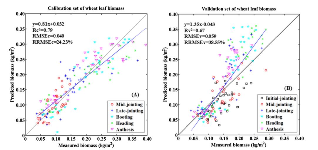 图3 SIPLS-SPA在校准(A)和验证(B)中估算的小麦叶片生物量的实测值与预测值之间的1:1拟合关系