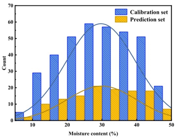 在得到校正后的高光谱图像后,对单个南瓜籽进行分割,提取每个南瓜籽的光谱。采用最大类间方差法(Otsu)获取图像阈值,将灰度图像转换为二值图像,利用形态学操作去噪并获得连通区域,绘制开放操作二值图像,提取感兴趣区域(ROI)光谱。同时,利用重量法得到各南瓜籽水分含量的参考值。如表1所示,校准集样品的含水率范围(8.52-48.93%)大于预测集样品的含水率范围(9.18-48.05%)。图2直方图显示了南瓜籽水分含量在校准集和预测集中的分布趋势相似,呈正态分布。因此,样品含水率范围有利于建立稳定的水分预测标定模型。