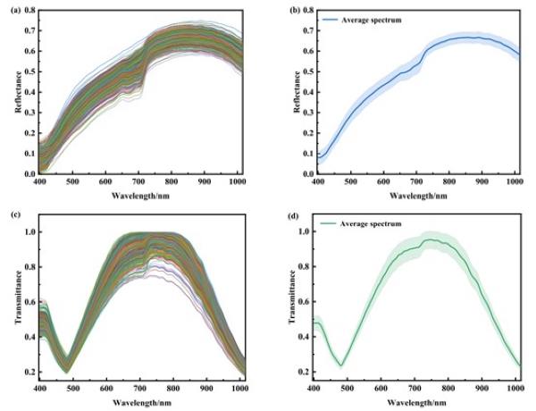 图3. 南瓜籽的反射和透射光谱:(a)所有样品的反射光谱;(b)平均反射光谱;(c)所有样品的透射光谱;(d)平均透射光谱