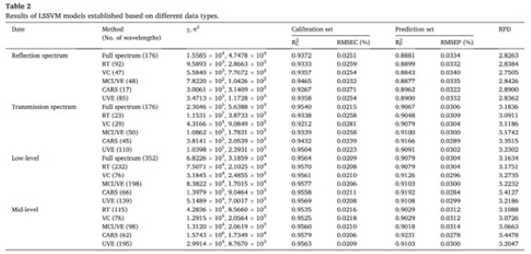 基于反射光谱、透射光谱、低水平融合和中水平融合建立了PLSR和LSSVM模型。模型计算结果表2所示。表中显示了Rc2、RMSEC、Rp2和RMSEP值,用于比较基于不同数据的模型结果。