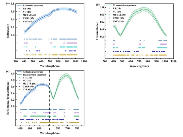 图4. 每种变量选择方法在不同数据集中保留的变量位置:(a)反射光谱;(b)透射光谱;(c)低级数据融合