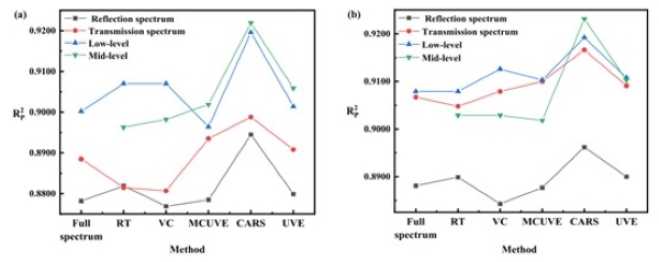 在反射光谱中,RT、VC、MCUVE、CARS和UVE算法分别选取了92个、47个、48个、17个和85个变量。在透射光谱中,RT、VC、MCUVE、CARS和UVE算法分别选取了23个、29个、50个、45个和110个变量。在低级数据融合中,RT、VC、MCUVE、CARS和UVE算法分别选取了232、76、162、66和139个变量。从图5中可以看出,基于CARS的模型对于线性PLSR和非线性LSSVM模型的Rp2都是最高的。此外,在大多数情况下,CARS保留的特征变量比其他变量选择方法少。这表明CARS算法可以显著减少不相关信息,保留特征变量,保持较高的模型精度。另外,图5显示,基于CARS算法的中级融合数据在两种模型中Rp2最高,这进一步证实了CARS算法在本研究中的优越性。因此,CARS算法是本研究中最优的变量选择方法。