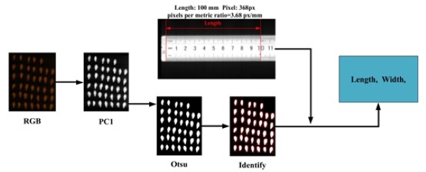 要测量单个南瓜籽的长度和宽度,必须确定每个单位公制对应的像素数,该实验每公制像素比为3.68 px/mm。首先,使用Otsu方法对PC1图像进行分割。种子与背景对比明显,分割后的图像与实际图像高度一致,保证了测量值在很小的误差范围内。接下来,计算每个种子的长度和宽度所占用的像素数。最后,根据计算的像素数计算出每个南瓜籽的长度和宽度。