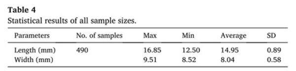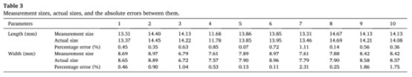 为了验证测量的南瓜籽尺寸是否与实际尺寸一致,用游标卡尺测量了10个南瓜籽的长度和宽度,每个数值测量三次。取测量结果的平均值作为最终值。表3显示了测量尺寸、实际尺寸和百分比误差。长度和宽度的误差范围分别为0.07% ~ 1.11%和0.11% ~ 2.31%。测量值与实际尺寸之间的差异很小。因此,本研究证明了利用高光谱反射图像确定南瓜种子尺寸的可行性。