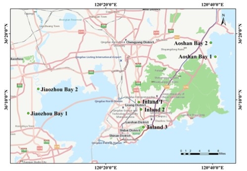 试验样品采自中国青岛内陆、鳌山湾和胶州湾的0 ~ 20 cm表层土壤。图1为土壤取样位置图。内陆、鳌山湾和胶州湾以棕壤、盐土和潮土为代表,以山地土、湿地土和滨海土为典型。棕壤是青岛内陆地区分布最广、最广泛的土壤类型,主要分布在山地丘陵和山前平原。因此,收集山地土壤和河滨土壤可以代表青岛的内陆土壤。