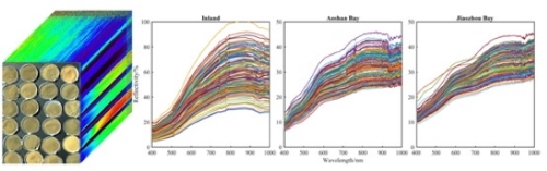 图2. 以内陆、敖山湾、胶州湾土壤样品的高光谱图像和平均反射率光谱采集为例