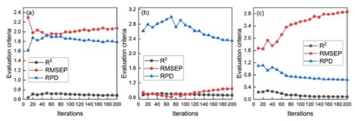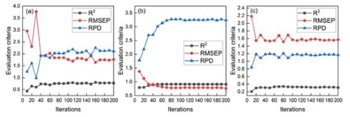 在鳌山湾和胶州湾的HSI中,每个像元的光谱波段为360,三个样图模型的学习率设为1e-2,权值衰减设为1e-6,采用自适应矩估计(Adam)进行优化,批大小设为16。迭代次数设置为10 ~ 200次,间隔为10,分别计算内陆、鳌山湾和胶州湾的R2p、RMSEP和RPD。不同迭代SpeMN的预测评价结果如图3所示。在SpeMN中,当内陆湾、鳌山湾和胶州湾土壤样品的迭代次数分别为50、70和20次时,R2p和RPD值*大,RMSEP最小,预测效果*好。