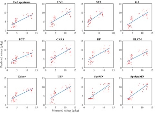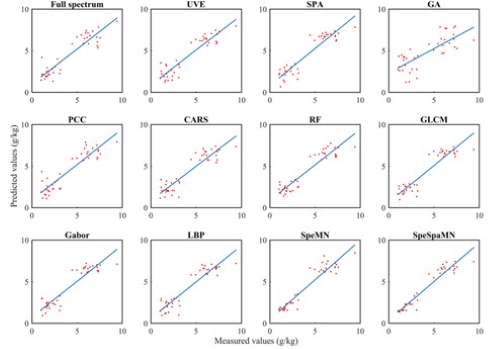 在鳌山湾多种特征提取方法的土壤碳含量预测结果中,基于3个评价标准分析,除GA和PCC外,其他特征提取方法均优于全光谱预测。在提取光谱特征的方法中,RF预测精度最高。在3种仅提取空间特征的方法中,R2p与RF基本一致,RMSEP值低于6种仅提取光谱特征的方法,RPD值高于6种仅提取光谱特征的方法。预测效果*好的是LBP。各方法的预测准确度由高到低依次为:SpeSpaMN、SpeMN、LBP、Gabor、GLCM、RF、UVE、SPA、CARS、Full-spectrum、PCC、GA。SpeSpaMN显著提高了鳌山湾土壤碳含量的预测精度,实现了对土壤碳含量更准确的预测。