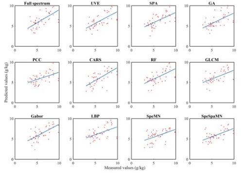 图6. 敖山湾土壤碳含量实测值与预测值的多特征提取拟合结果