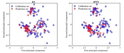 图8. 由KS和SPXY划分内陆校正集和预测集的主成分空间分布图