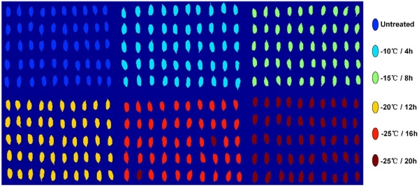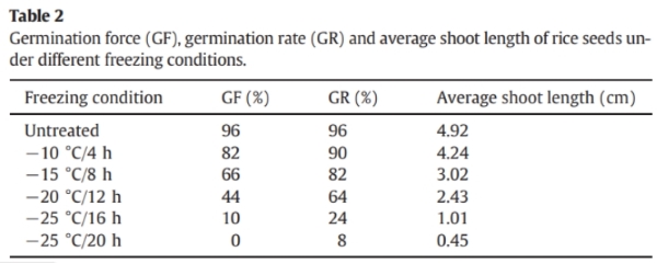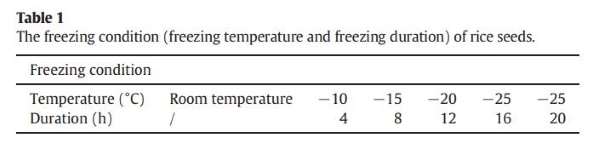 本实验使用的水稻种子品种为“艳风”,2018年收获于辽宁盘锦,初始含水量13%至14%(干种子)。随机选取1800粒种子,并人工调整含水量至30%,以研究霜冻损伤。种子被随机分为6组,每组300粒,其中一组为对照组,未冷冻处理,其余5组在不同温度下冷冻不同时间(见表1)。冷冻后,种子在25°C干燥通风环境中放置一周,以恢复正常温度并减少水分干扰。