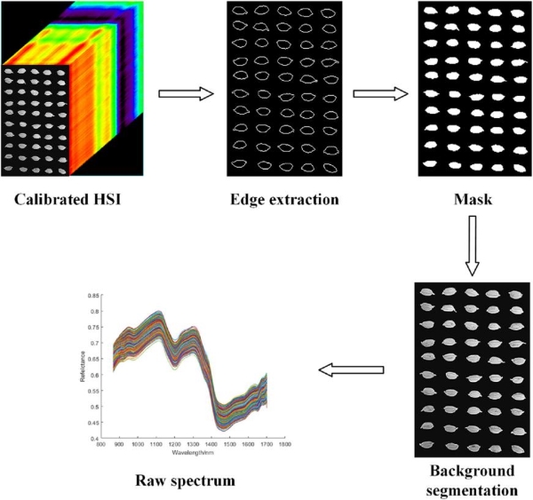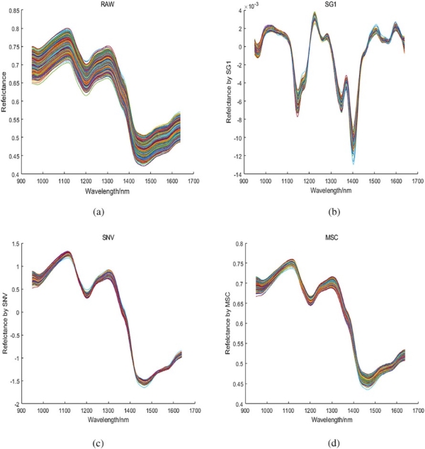 在本实验中,选用了江苏通宝TB888科技有限公司的“GaiaSorter”高光谱成像系统。该系统的核心组件包括均匀光源、光谱相机、计算机以及相关的控制软件。在光谱成像仪中使用的相机是“Image-λ”系列高光谱相机,其光谱范围大约为900-1700 nm。系统的工作原理是将待测样品放置在由软件控制的电动移动平台上,并采用推扫法来收集图像。随着电动平台的移动,最终获得了包含待测样品光谱信息和图像信息的高光谱立方体数据。由于原始光谱数据中存在的噪声会干扰后续的数据分析,因此本实验选取SG1、SNV和MSC方法对原始光谱数据进行预处理。