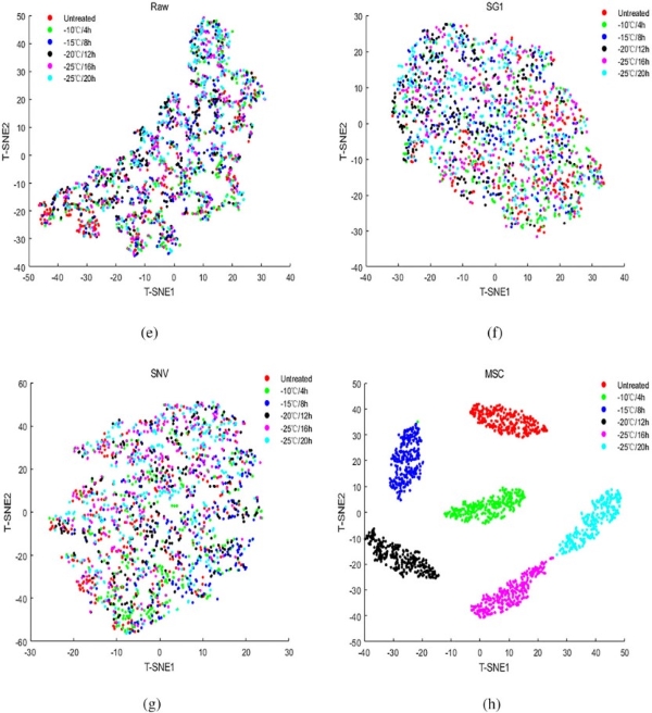 图4展示了不同预处理方法的光谱曲线及t-SNE可视化结果。从图4e可见,原始光谱数据在不同冷冻条件下混合重叠,降维后特征难以区分。图4f和4g显示,SG1和SNV处理后仍存在大量重叠,与原始数据相比无明显改善。而图4h表明,经MSC预处理的数据聚类效果显著,6组水稻种子被清晰分类。总体而言,MSC处理后的光谱数据优于其他方法。