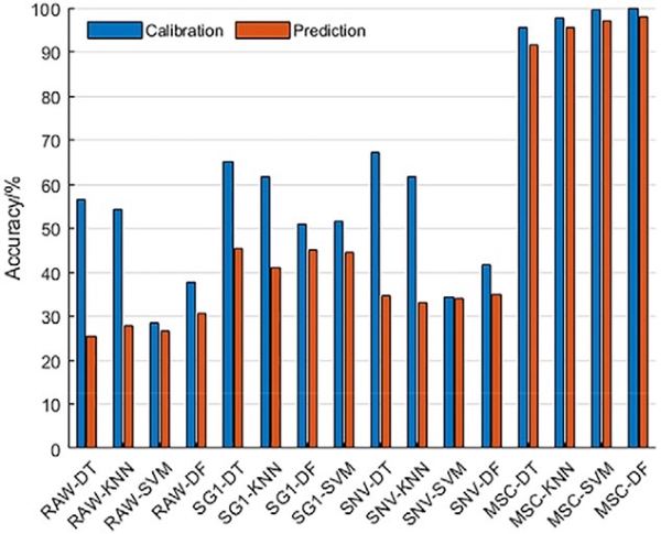 在建模前,所有样本随机分为校准集和预测集,比例为3:1。为了选择*佳的预处理方法和模型组合,将原始光谱数据以及经过SG1、SNV和MSC预处理的光谱数据分别输入到DT、KNN、SVM和DF模型中。图5显示了基于全波长的建模分析结果。可以看出,经过MSC处理的光谱数据具有最高的建模准确率,均高于90%。这与t-SNE可视化的结论一致。