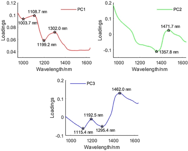 图6. 利用前三个主成分载荷曲线提取的特征波长。