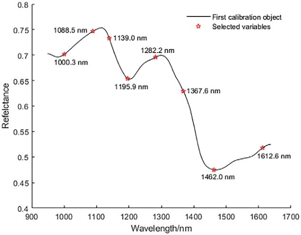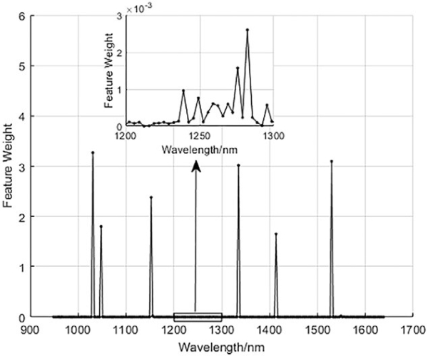 NCA算法用于高维数据特征选择,通过计算变量权重筛选重要特征。图8显示,在210个波长中,仅6个波长权重显著高于0,表明多数波长对区分霜冻程度贡献较小。最终选出的六个特征波长依次为1030.9、1529.6、1334.9、1152.4、1047.9和1413.3 nm,它们与水稻种子化学成分密切相关。