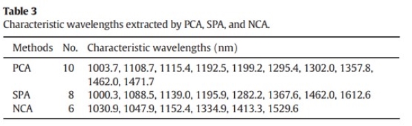 表3展示了三个特征提取算法提取的特征波长。可以看出,PCA和SPA提取的特征波长非常接近,NCA算法提取的特征波长数量最少。