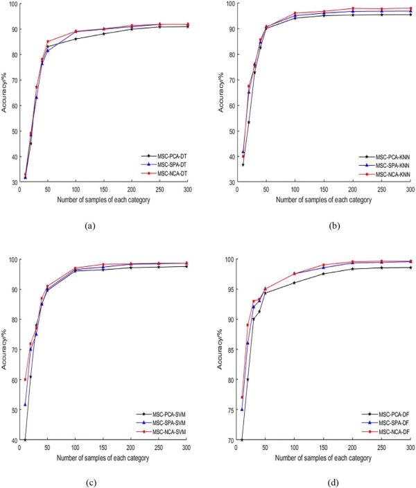 为了评估不同模型的有效性,我们将总样本集(6类水稻种子,每类300粒,共1800粒)分成不同样本集,包含每类水稻种子10至300粒不等。模型的准确率通过五折交叉验证获得。图9a至d展示了基于DT、KNN、SVM和DF模型在不同样本集数量下的结果。整体上,PCA的效果不如NCA和SPA。在比较后发现,当样本集较少时,NCA提取的特征波长建模效果优于SPA,且随着样本集增加,二者的效果趋于接近。此外,NCA提取的特征波长数量少于SPA,有助于提升运算速度。因此,NCA被选为*佳特征提取算法。