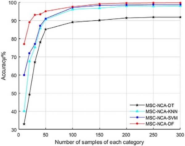 图10. 基于NCA的不同样本集数量下DT、KNN、SVM和DF模型的建模结果