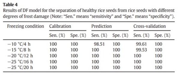 表2显示,不同冷冻条件下水稻种子的发芽势(GF)、发芽率(GR)和平均芽长均下降。正常种子的GF与GR一致,而霜冻*害种子的GF低于GR。GR高且GF强表明幼苗出土快且整齐,GF弱则出土不均且幼苗弱。在-10°C/4小时下,GR达90%,GF仅82%,且平均芽长较短,表明轻微霜冻*害。这些种子播种后出苗不足,影响收成,因此快速无损识别霜冻*害种子对农业生产至关重要。