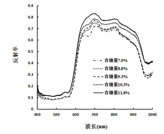图5为青色甜瓜不同含糖量的光谱曲线图,从图中可知,在430-550 nm范围内,随着含糖量的升高其光谱反射率减小;在550-700 nm区间随着甜瓜糖度的升高,其反射率升高;在550-580 nm区间反射率上升较快,形成陡坡;在680 nm附近,低糖度的甜瓜瓜瓤出现低谷,含糖量越高,谷值越深;与西瓜瓜瓤相似,在700 nm和800 nm附近也有2个峰值;在700-1000 nm区间,糖度与光谱反射率曲线无显著规律变化。